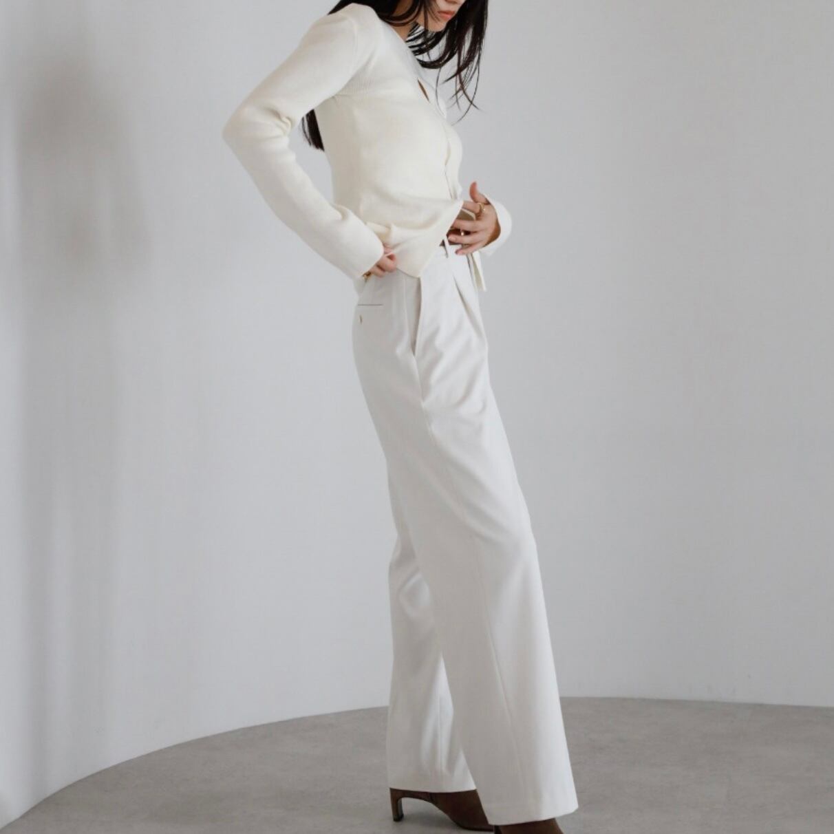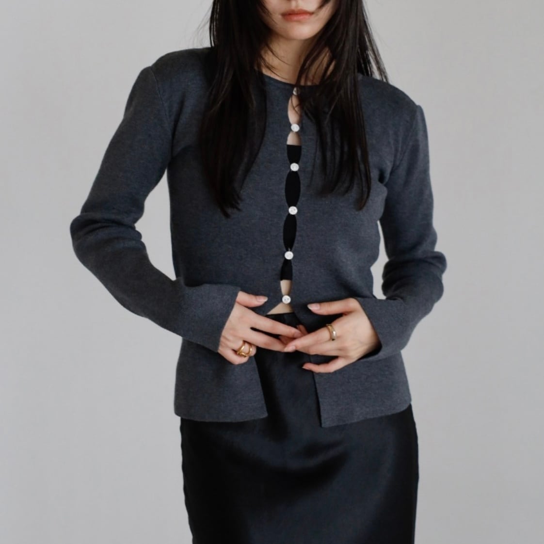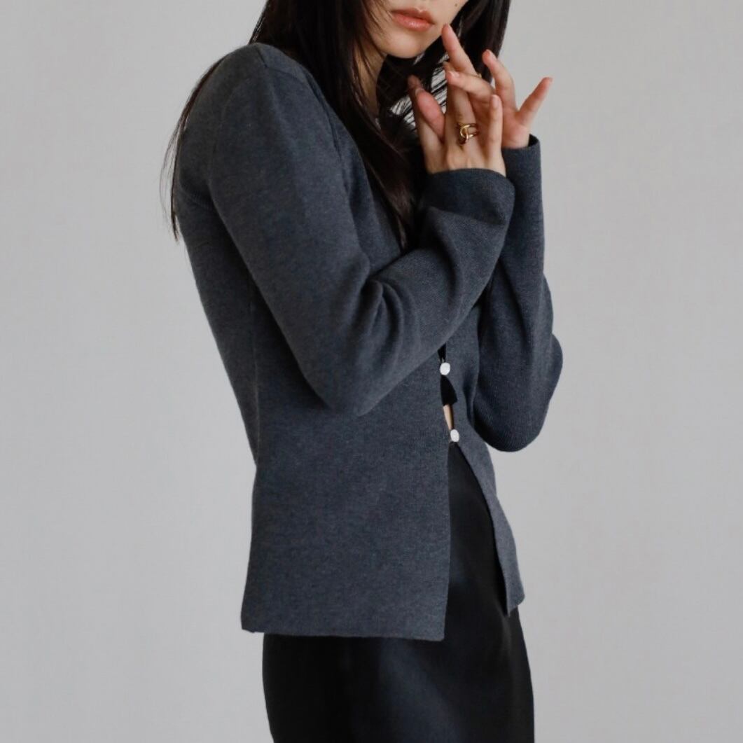 ボタンディテールの程よいアクセントで、シンプルな中に洗練された表情をプラス。