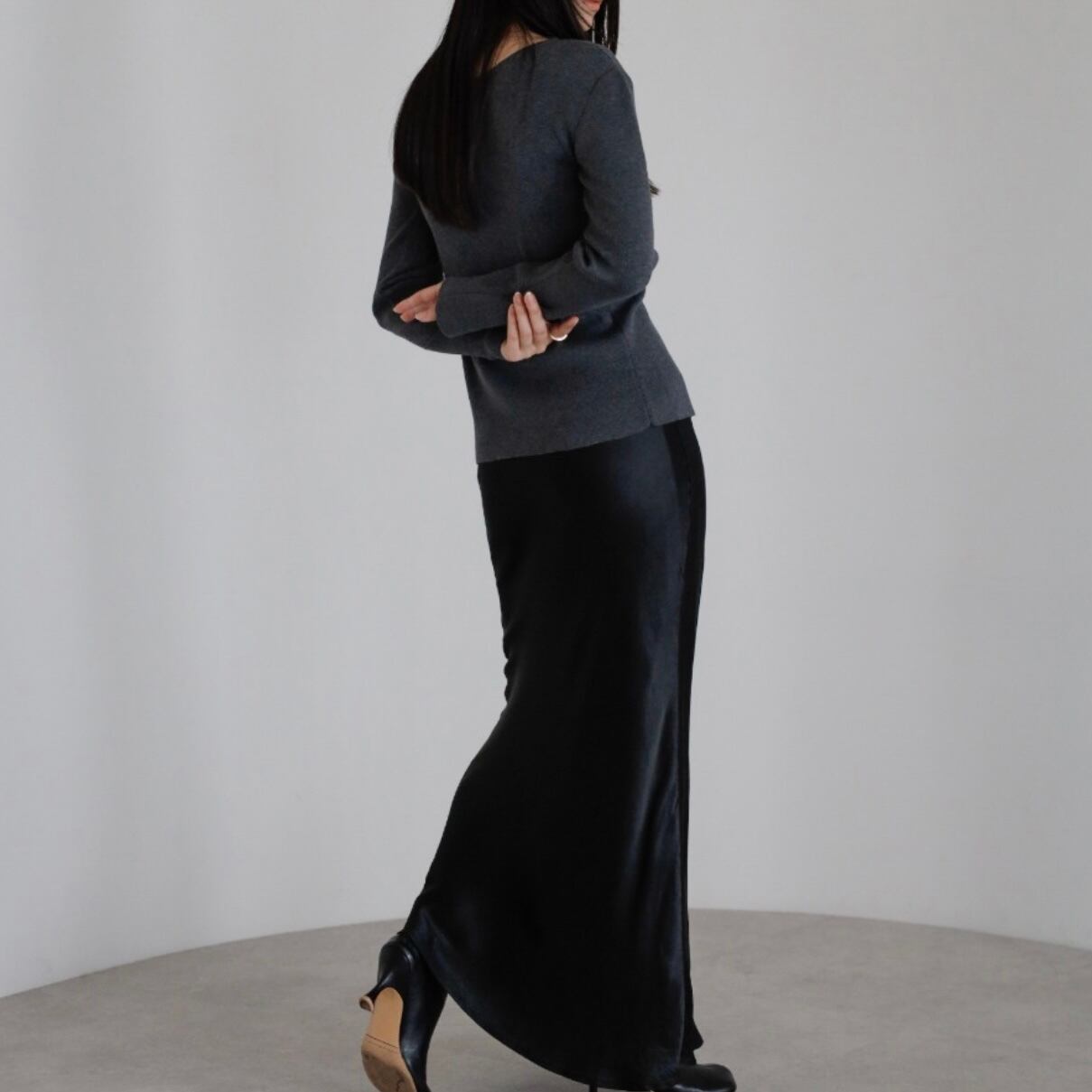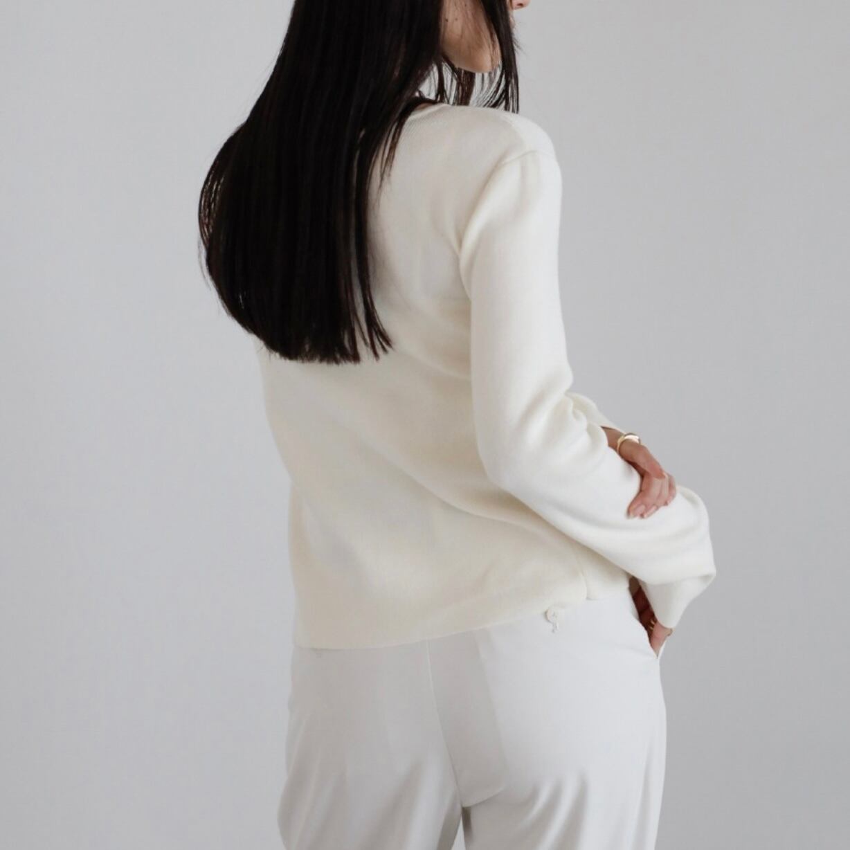 すっきりとしたシルエットに仕上げたニットは、レイヤードスタイルにも重宝する一枚です。