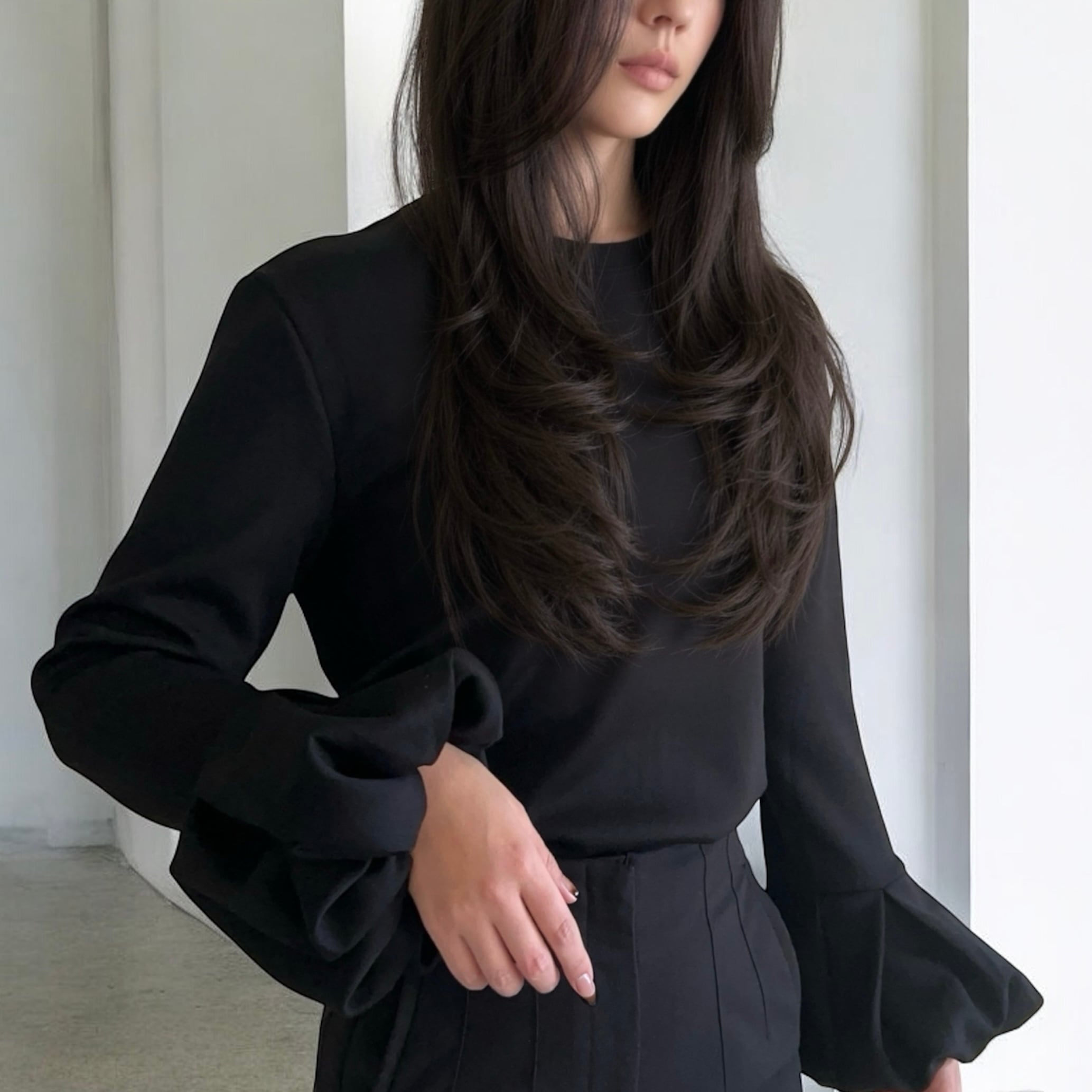 大きなバルーンスリーブが華やかさを演出するトップス。